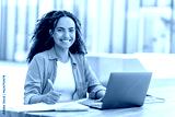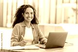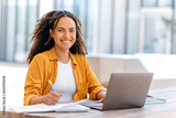 Beautiful positive brazilian or hispanic curly young woman, university student, sitting near campus, with laptop and notebook, preparing for exam, looks at camera, smile. Successful female freelancer