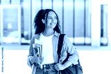Happy female student. Positive female student, brazilian or hispanic nationality, with a backpack, holding books and notebooks in her hand, stand near the university campus, looks away and smiling