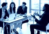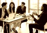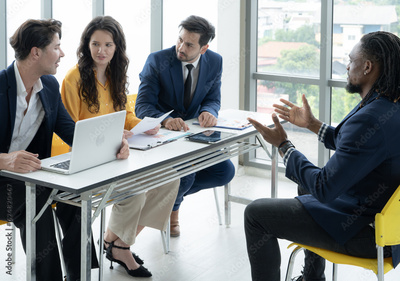 Job interview concept. Employer and diverse hr team doing job interview with a black man in business office. Job candidate talks with human resources team. Hiring, employment, and recruitment concept.