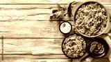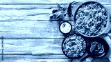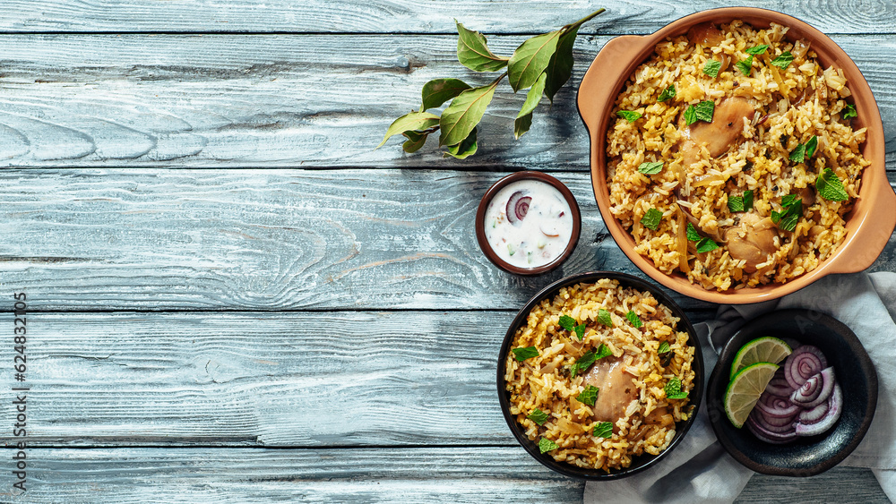 Pakistani food - biryani rice with chicken and raita yoghurt dip. Delicious hyberabadi chicken biryani on gray wooden background. Top view or flat lay. Copy space for text or design. Banner