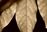 Closeup shot of a water drops on green leaves in summer rainforest. Floral texure. Macro photography. Nature concept background
