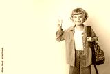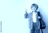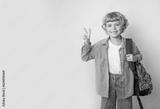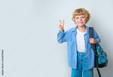 Primary school smiling boy girl with backpack showing victory peace sign smiling at camera. Copy space for advertising blank concept. Back to school. Childhood, education, products for children