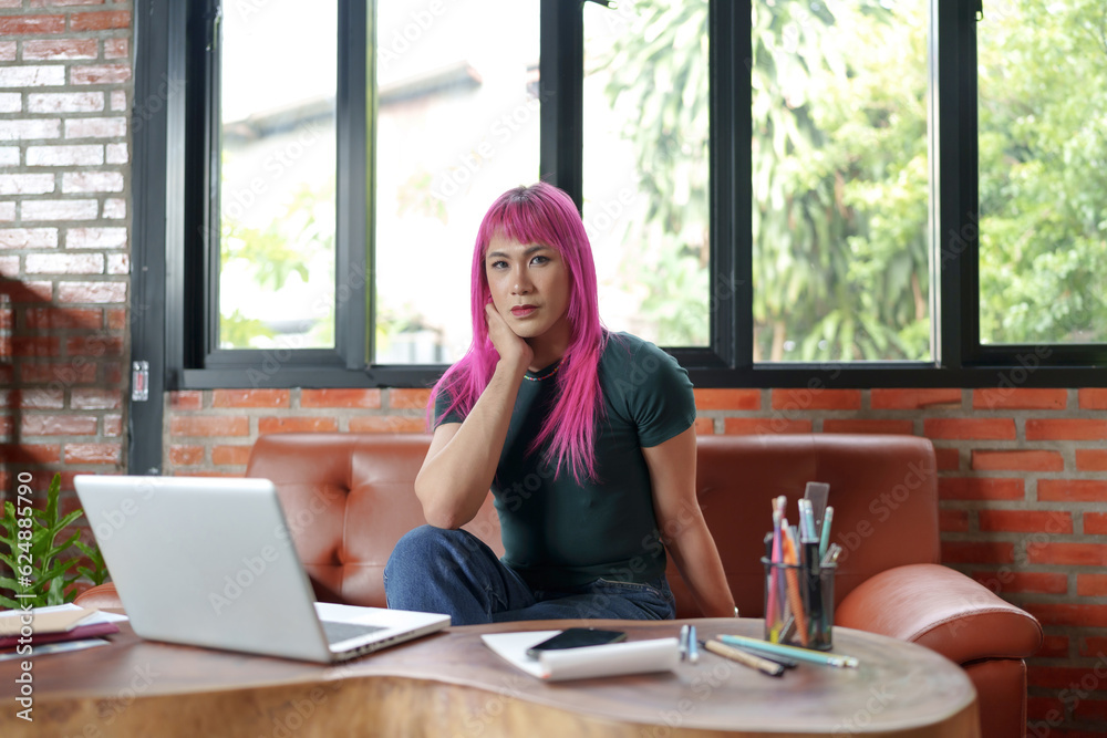 Asian transgender Pink Hair Working on Design Business Gender equality LGBTQ+ concept
