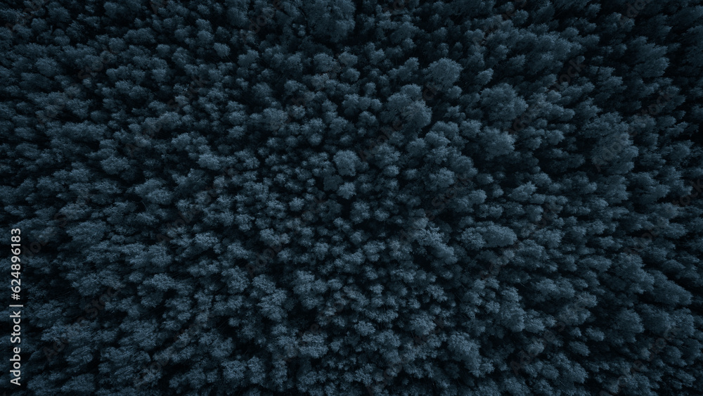 Aerial view of a dark winter snow-covered pine forest. Winter forest texture. Aerial view. Aerial drone view of a winter landscape. Snow covered forest. Aerial photography winter texture background