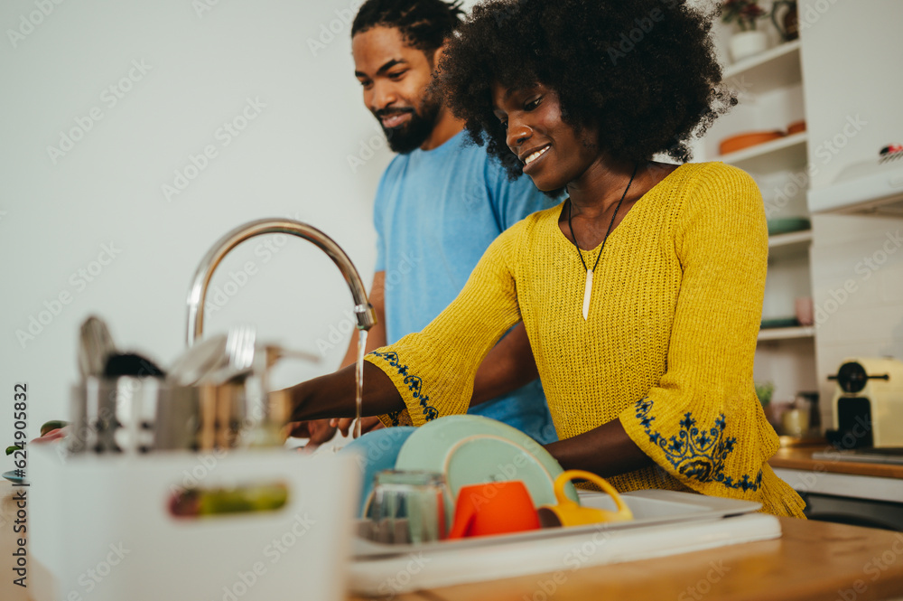 A cheerful african american couple is doing dishes and cooking lunch at home together.