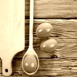 Dyed lavender color easter eggs and wooden chopping board and spoon on wooden table background.