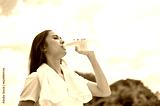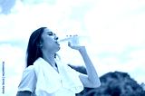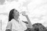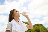 A healthy Asian woman is drinking water from a bottle, feeling thirsty, resting after a long run