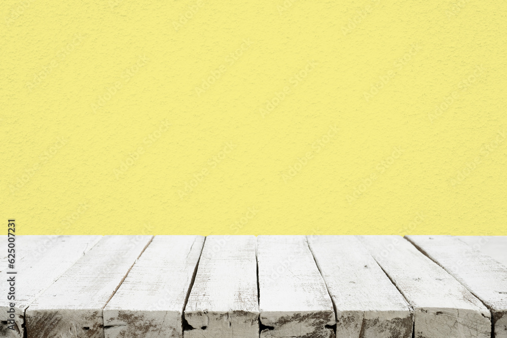 selective focus.white empty of wood table top on yellow pastel color background.F