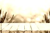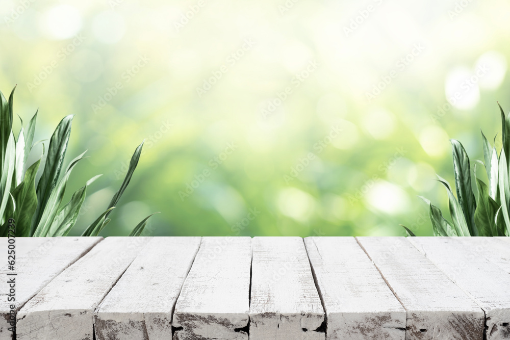 selective focus.nature product display with wood table counter on blur tropical leaf background