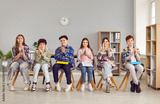Student audience clapping hands in class. Group of happy school children sitting in a row in the classroom and applauding after a good educational presentation