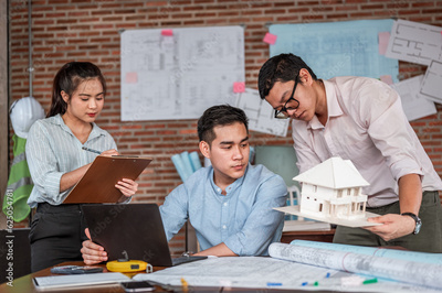 Concepts Architecture and engineer, Engineering, Design, Planning. Businessman and architech meeting for planing and checking house design and house model and secretary takes notes meeting.