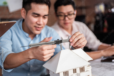 Concepts Architecture and engineer, Engineering, Design and Planning. Engineering hands hold vernier caliper working and checking house model scale between meeting.