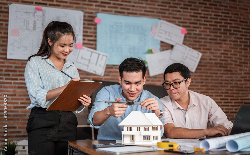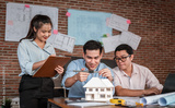 Concepts Architecture and engineer, Engineering, Design, Planning. Male architect hands measuring and making model house with them team on the desk at sunset.