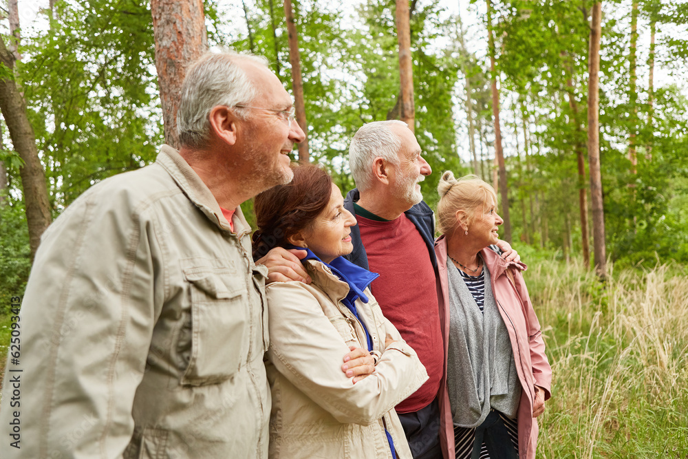 Senior male and female friends standing in forest