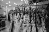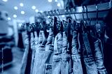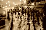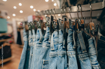 Denim pants in clothing store. Jeans on hanger hanging on rack in clothing store. Fashion retail shop inside shopping mall. Clothes on hangers in a clothes shop. Denim Jeans display on clothing rack.