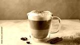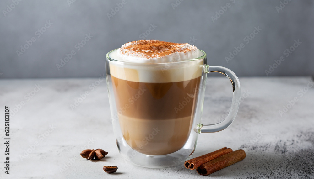 Side view of delicious cappuccino coffee with milk foam sprinkled with cinnamon in a transparent glass mug on a gray background, horizontal format