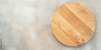 Empty wooden round board on light kitchen table. Wooden pizza platter, Long banner format. top view