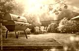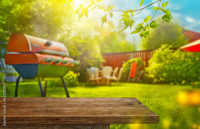 summer time in backyard garden with grill BBQ, wooden table, blurred background