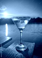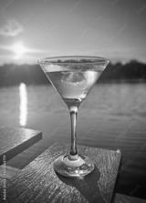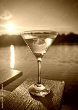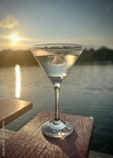 A martini cocktail sits on the arm of a red chair by a sunset over the water.