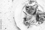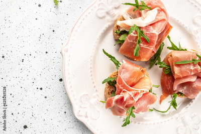 Jamon Iberico with white bread. banner, menu, recipe place for text, top view