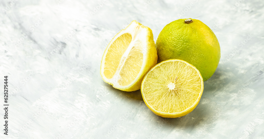 Bergamot, Fresh bergamot citrus fruits on a light background, Long banner format. top view