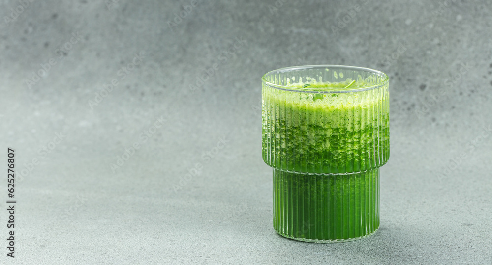 Freshly blended green smoothie in the jar. Detox and clean diet concept. place for text, top view