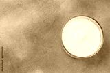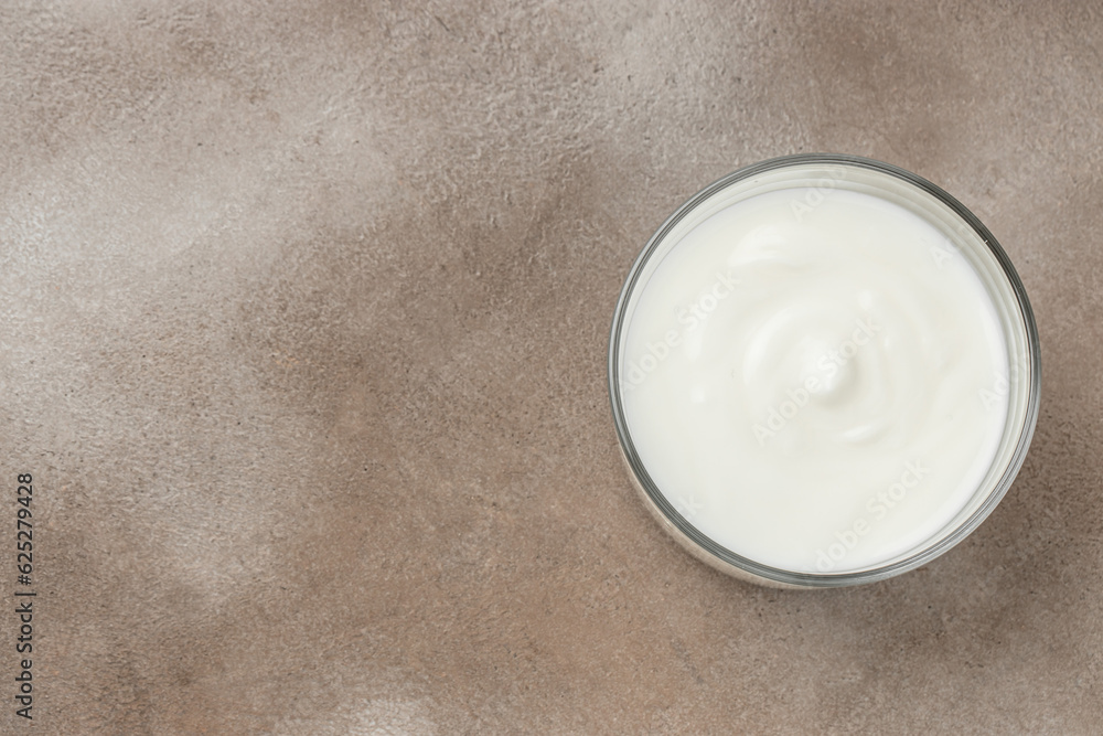 Creamy natural yogurt on a light background, Probiotic cold fermented dairy drink. Long banner format. top view