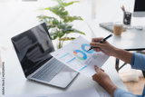 Businesswoman hand pointing to financial data graph. Business Analysis and Investment. Accountant checking business income and profits.