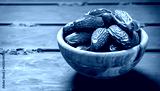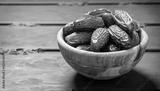 Dates or dattes palm fruit in wooden bowl is snack healthy.