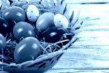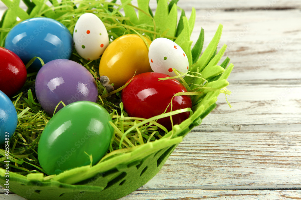 Colorful easter eggs in a paper straw nest in fabric basket on white wooden table background.