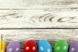 Dyed eggs and Easter eggs on white wooden table seen from above