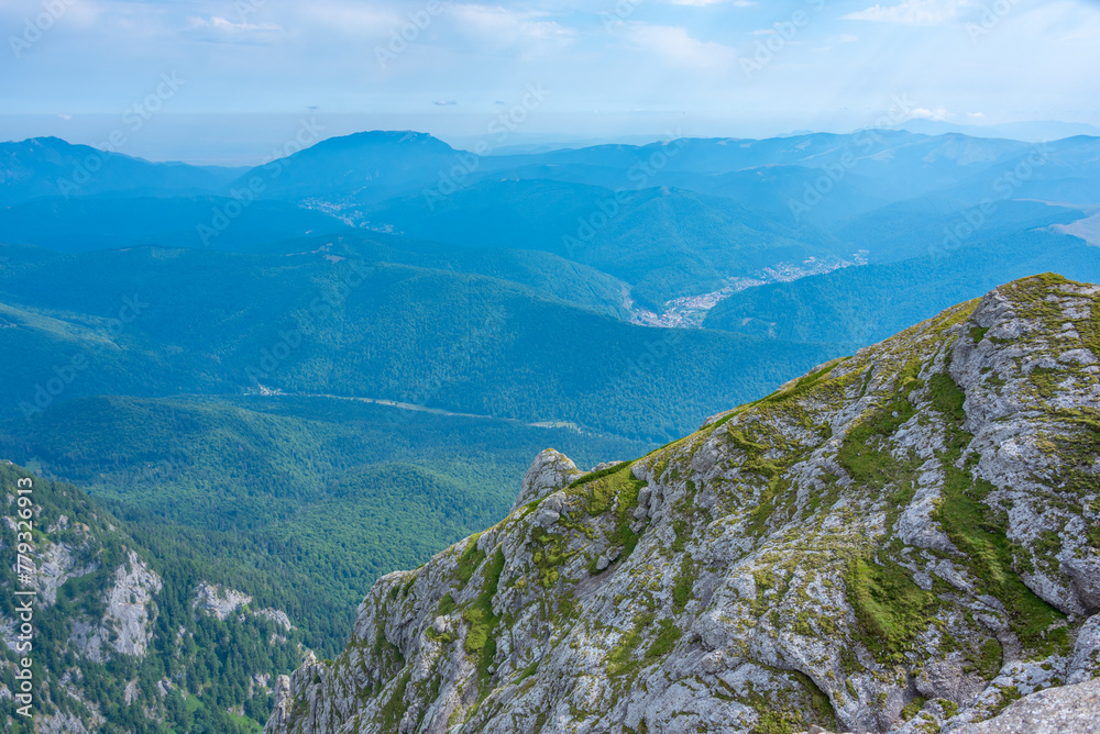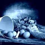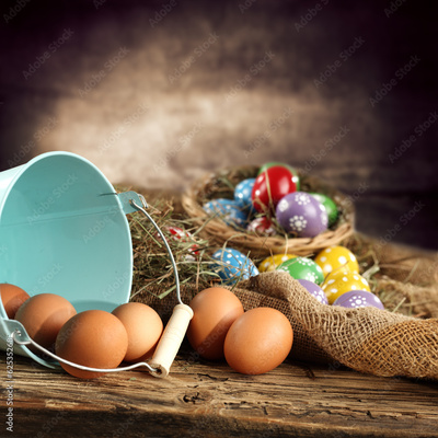 Easter eggs in wicker basket and fresh eggs falling out of bucket onto linen table cloth withdark grunge wall background.