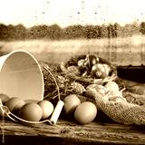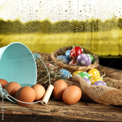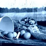 Colorful and dyed eggs and Easter eggs on a wooden table spilling out of a metal blue bucket against the background of a window with rain-wet glass.