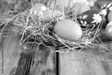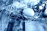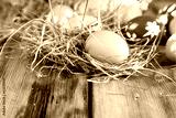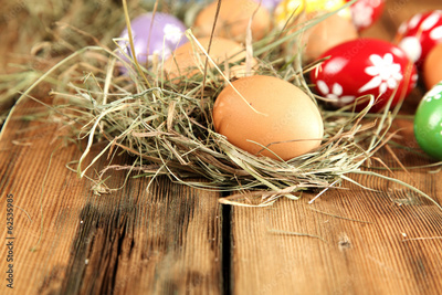 Colorful easter eggs in a straw nest on wooden table background.