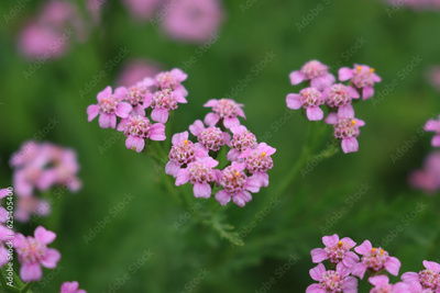 Close-up of pink yarrow flowers in th e meadow. Achillea millefolium wildflower in Italy