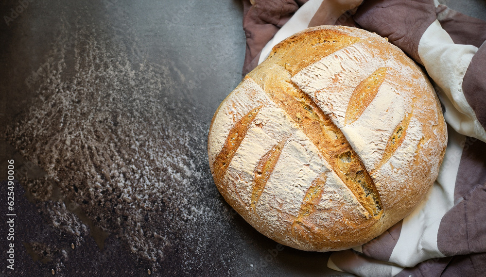 Fresh homemade crisp bread, top view. French bread. Bread at leaven. Unleavened bread