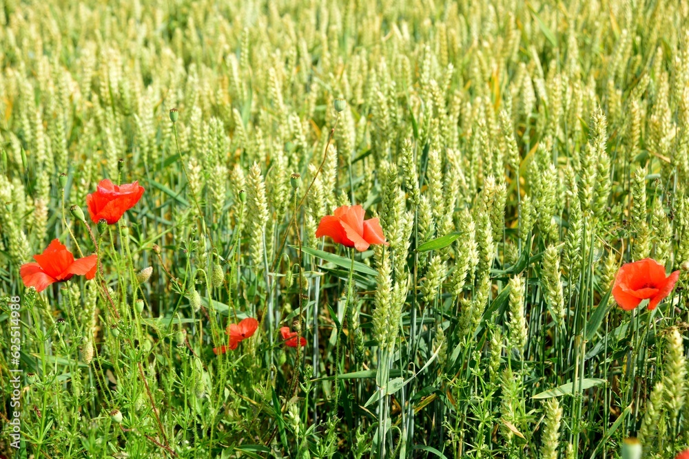 Ripe cereal field with red poppy flowers on a sunny summer day, Latvia
