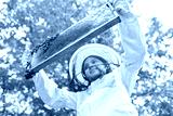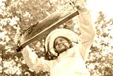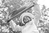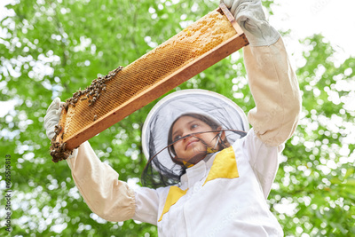 Girl examining honeycomb frame with honey bees