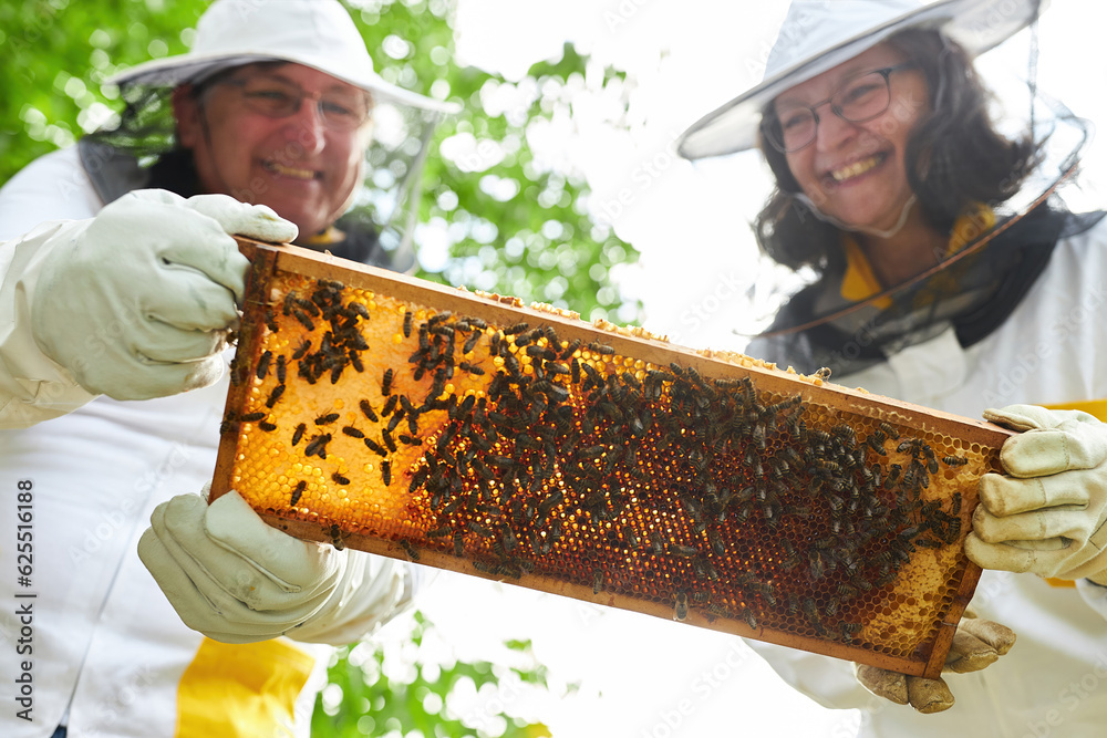 Happy female and male apiarist analyzing honeycomb frame