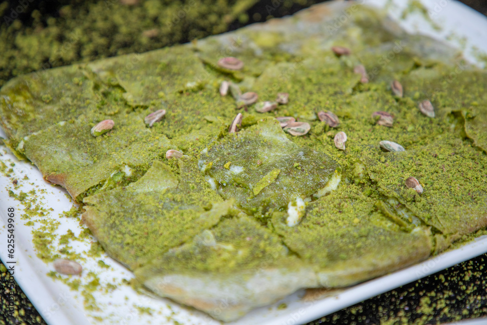 Delicious Turkish Traditional Dessert Katmer From Gaziantep - green pistachio, field of deph dessert food view, close up beautiful katmer photography