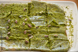 Delicious Turkish Traditional Dessert Katmer From Gaziantep - green pistachio, field of deph dessert food view, close up beautiful katmer photography