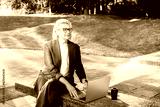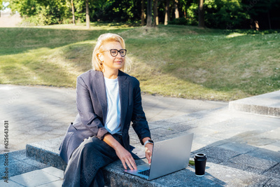 Dreamlike 50's confident mature businesswoman, middle-aged experienced senior female professional working on laptop outdoors in an office park. Coffee break. Female entrepreneur working remotely