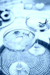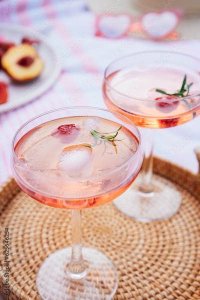 Pink drinks, cocktail with ice, raspberry, rosemary. Two glasses with martini, champagne, cider, lemonade on the blanket with fruit plate, picnic basket, Cozy summer picnic on nature. Selective focus