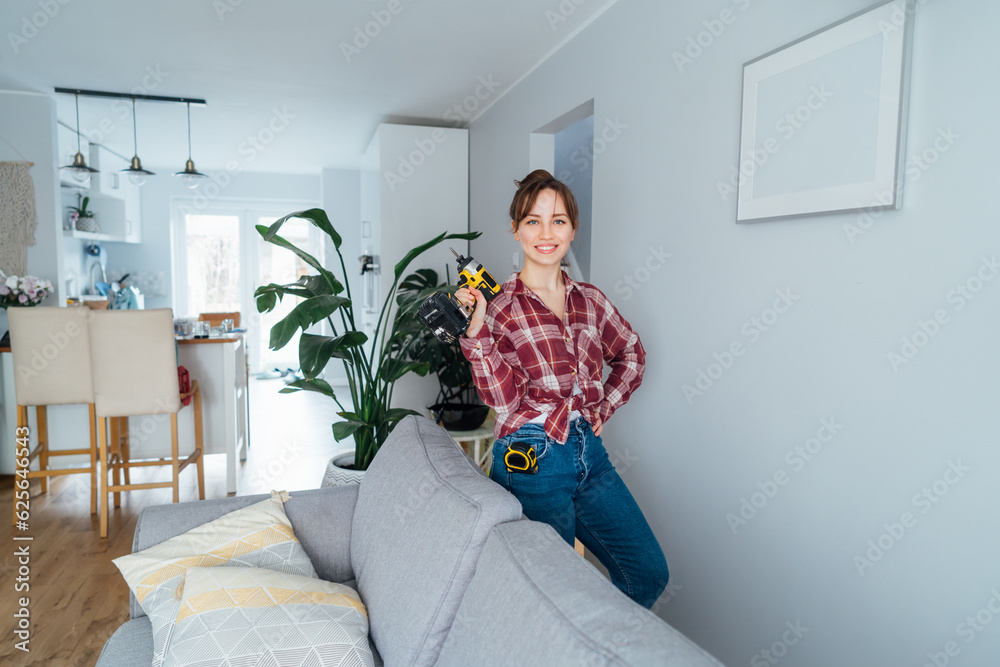 Happy smiling proud of herself young woman with electric screwdriver in hand after she put a picture on the wall at her home. Housekeeping work. Doing repair herself. Home decorating. DIY concept.