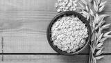oat flakes in bowl and ears on wooden table top view. Uncooked oatmeal