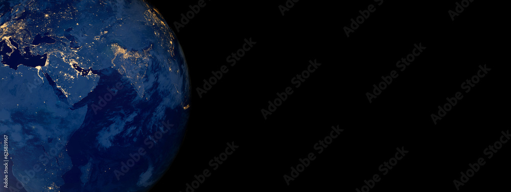 Earth at night from space on black background banner. Elements of this image furnished by NASA.