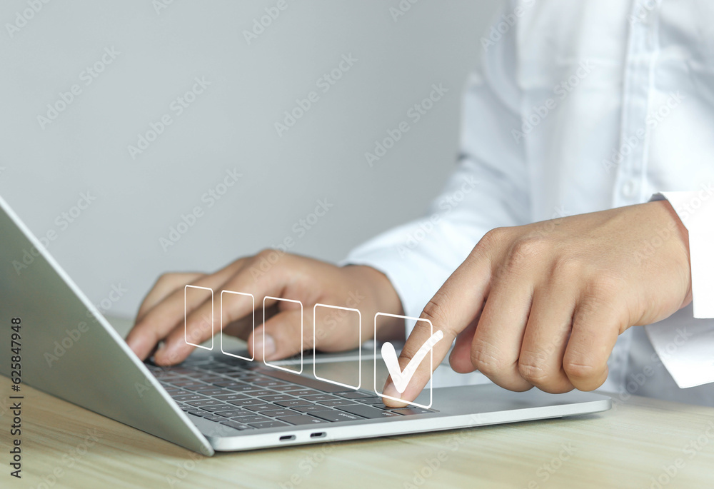 Businessman showing check marks summarizing work details, checklist, documents, and online quality assessment standards.