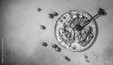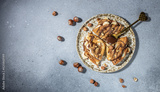 Homemade thin crepes with chocolate spread, banana and hazelnuts. breakfast or dessert. Long banner format. top view
