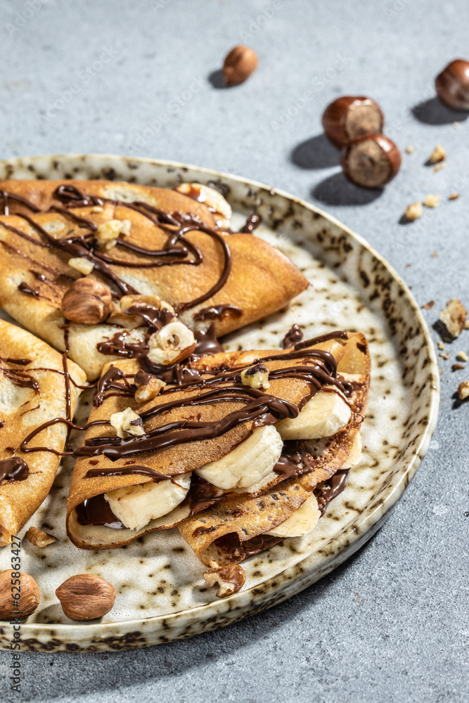 crepes with banana and chocolate. breakfast or dessert. vertical image. top view. place for text