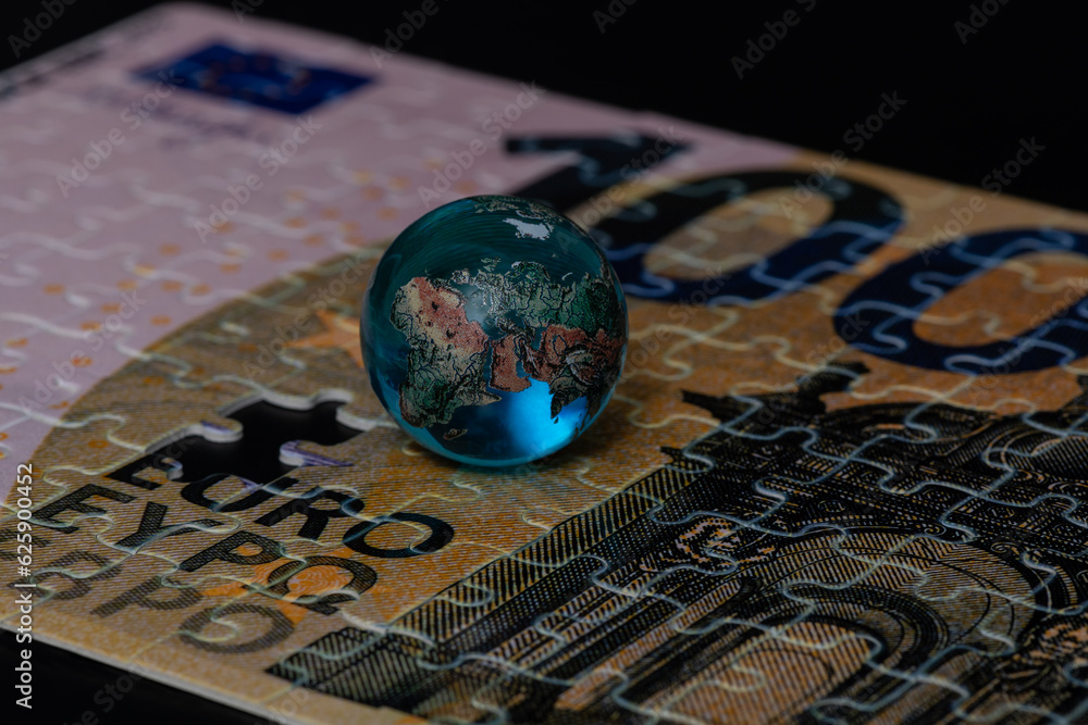 Glass globe and a 100 euro banknote assembled from a puzzle